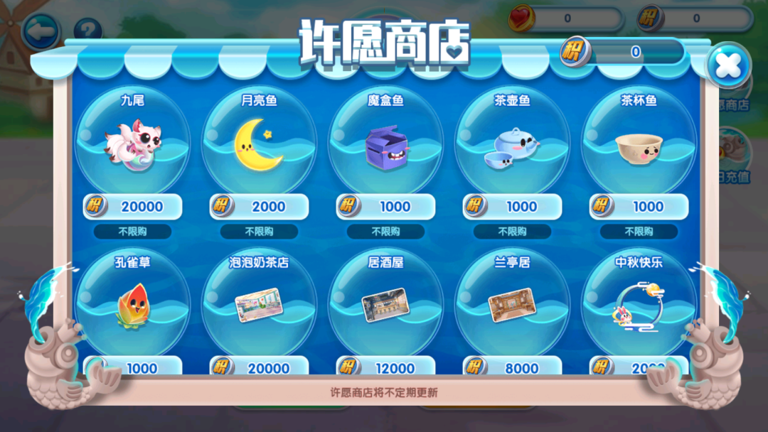 许愿商店内不定期会更新活动限定鱼和限定活动背景与头像框,这下错过活动的馆长不必怕,在这有超多活动限定鱼等你带回家~