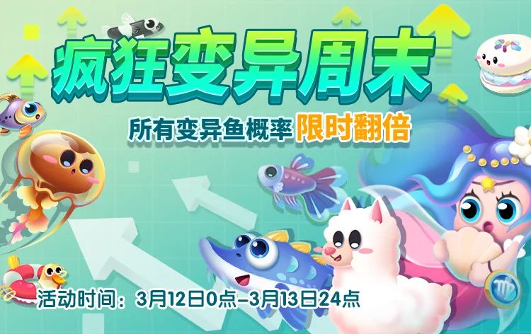 变异周末携手 Q 萌羊驼驼限时回归啦!在疯狂变异周末活动期间,所有变异鱼概率限时翻倍。准备好可变异的小鱼,在周末来一场疯狂变异~