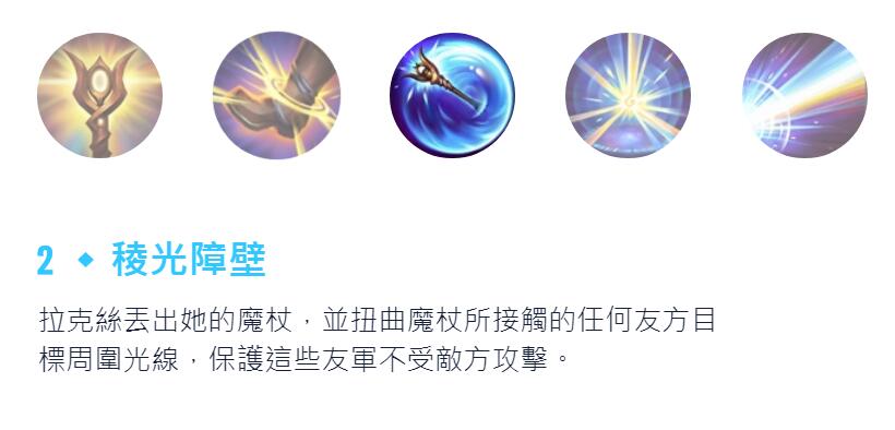 拉克丝是一个远程输出法师,所有技能均为非锁定目标的,所以释放技能时需要玩家具有一定的预判能力。技能释放的距离较远,若法术强度足够,可以在对手打不到自己的情况下一套技能可以杀死脆皮英雄。但伤害技能初始伤害低,护盾技能经历几个版本的改动,所能承受的伤害非常低,初始血量低,自身也是一个非常脆的英雄,所以应尽量避免与对方贴身战斗。