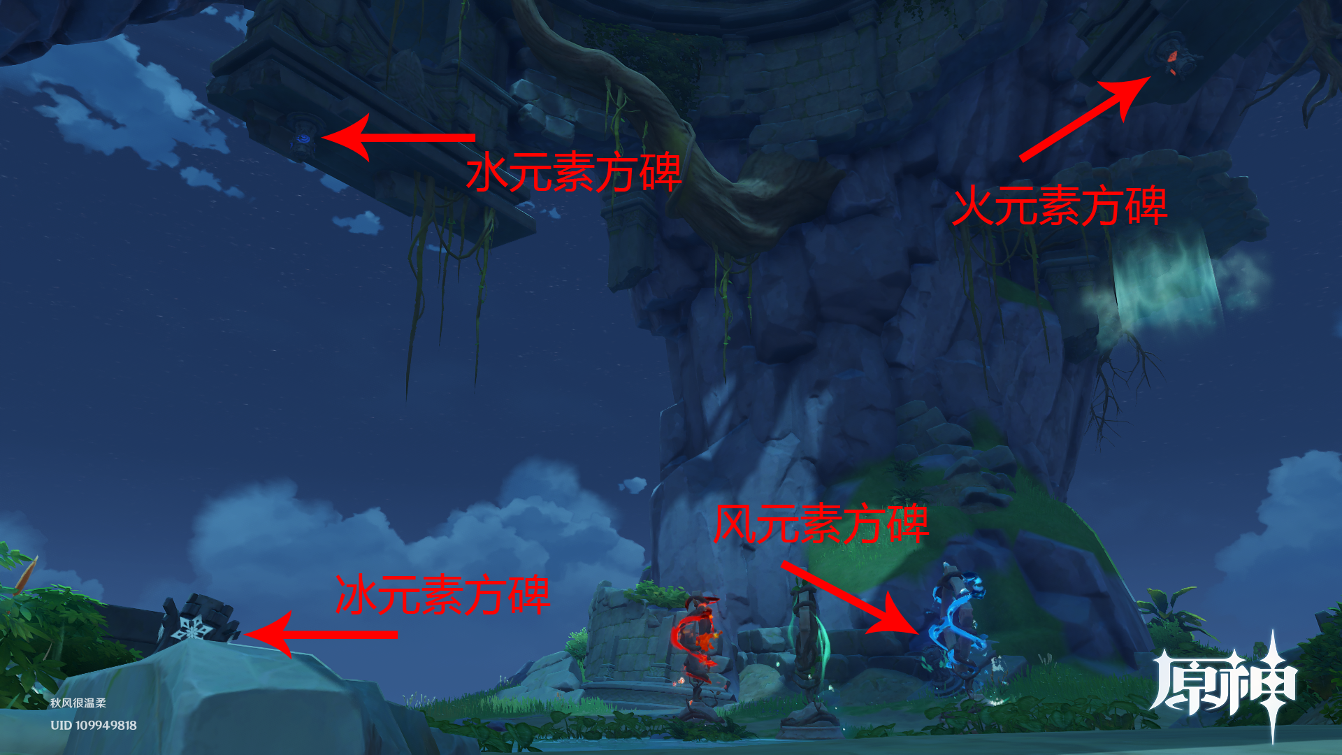 在岛中巨大的空洞中刚好有四个元素方碑,位置在上图中,旅行者只要按冰-风-火-水的顺序依次点亮即可。