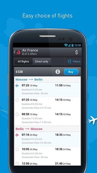 AWAD 2.0 is a new free application for air ticket purchase and hotel booking worldwide from anywayanyday.com. It is easy to start the search of air tickets: select the departure date, destination and number of passengers. Use the voice data input function or enter the data. The system analyzes offers of over 800 airlines to find the best flight options. For your convenience there are “quick” filters available at each step – choose between direct and indirect flights, sort our airports, departure/arrival time as well as flight cost and its duration.Search from 330 000 hotels is simple as well: select the city and period of stay - you will see a list of available accommodation which location can be found on the map. Hotel pictures and its detailed description will help you to choose the best options. If you just want to see hotels available in a certain city, you can simply enter the city name and click “search”.Additional benefit: if for some reason you decide to cancel your flight / hotel booking, you can do it directly in the application.The following payment methods are available in AWAD 2.0: For air tickets – via booking, by cash in mobile phone stores and by credit card. For hotels – by credit card. A message with your itinerary and / or hotel voucher will be sent to your e-mail and purchase notification - by SMS.With AWAD application all tickets and hotels are in your pocket!